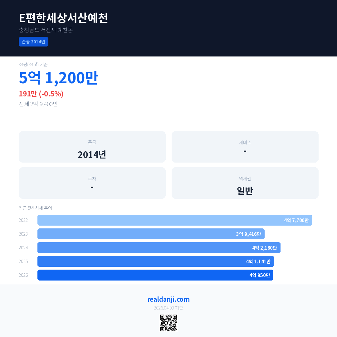 E편한세상서산예천 국민평형 기준 2026년 평균 거래가는 4억 950만으로, 전년 대비 0.5% 하락 했습니다.
