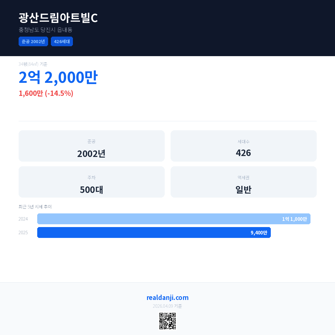 광산드림아트빌C 국민평형 기준 2025년 평균 거래가는 9,400만으로, 전년 대비 14.5% 하락 했습니다.
