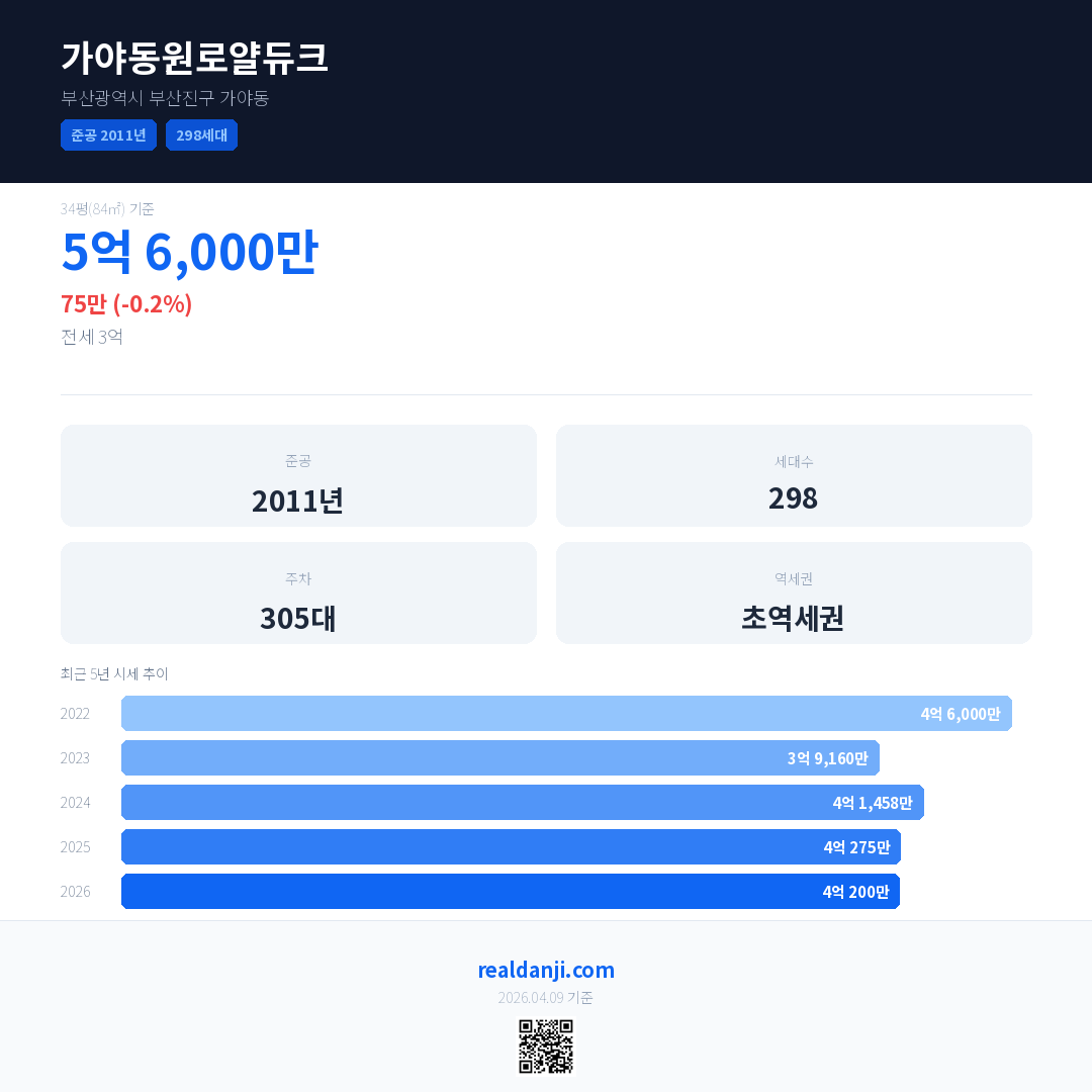가야동원로얄듀크 국민평형 기준 2026년 평균 거래가는 4억 200만으로, 전년 대비 0.2% 하락 했습니다.