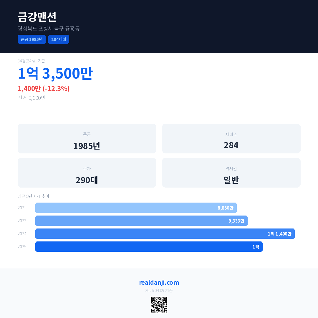 금강맨션 국민평형 기준 2025년 평균 거래가는 1억으로, 전년 대비 12.3% 하락 했습니다.