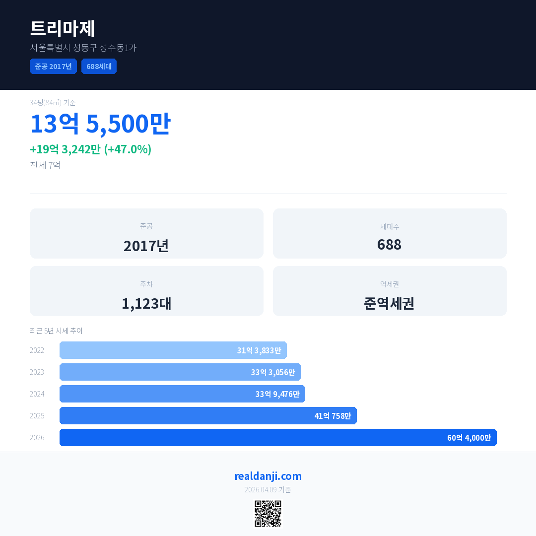 트리마제 국민평형 기준 2026년 평균 거래가는 60억 4,000만으로, 전년 대비 47.0% 상승 했습니다.