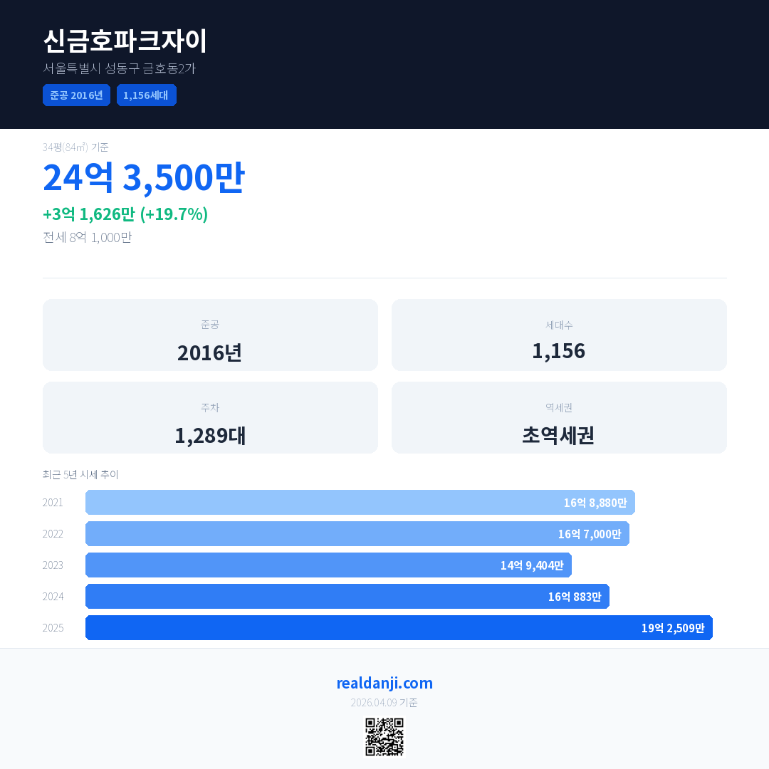 신금호파크자이 국민평형 기준 2025년 평균 거래가는 19억 2,509만으로, 전년 대비 19.7% 상승 했습니다.