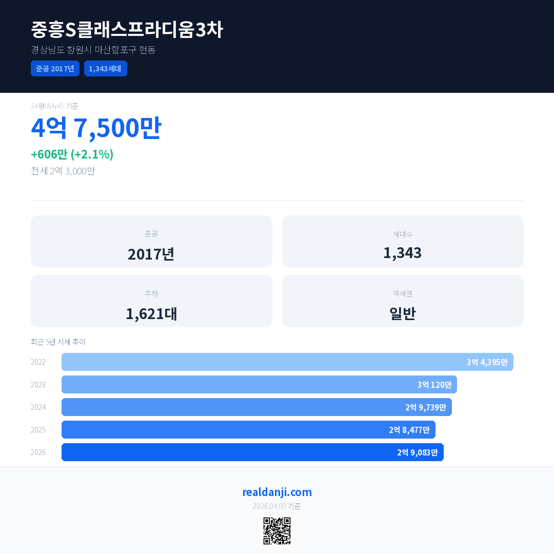 중흥S클래스프라디움3차은(는) 2017년에 준공되었으며, 현재 9년차입니다. 총 1,343세대 규모입니다.