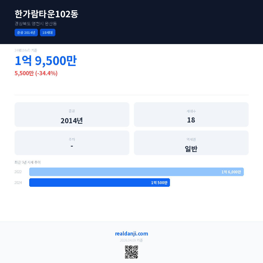 한가람타운102동 국민평형 기준 2024년 평균 거래가는 1억 500만으로, 전년 대비 34.4% 하락 했습니다.