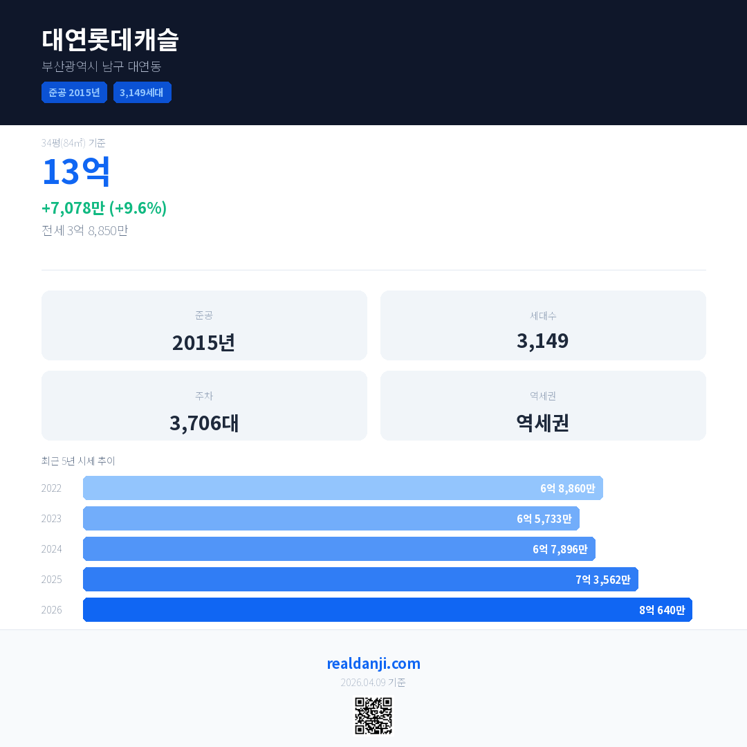 대연롯데캐슬 국민평형 기준 2026년 평균 거래가는 8억 640만으로, 전년 대비 9.6% 상승 했습니다.