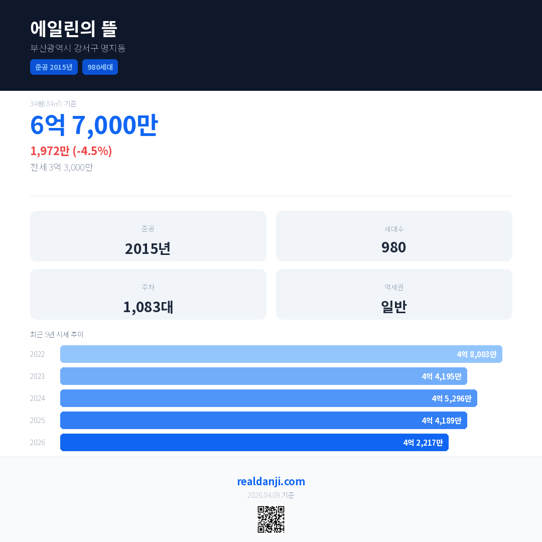 에일린의 뜰 국민평형 기준 2026년 평균 거래가는 4억 2,217만으로, 전년 대비 4.5% 하락 했습니다.