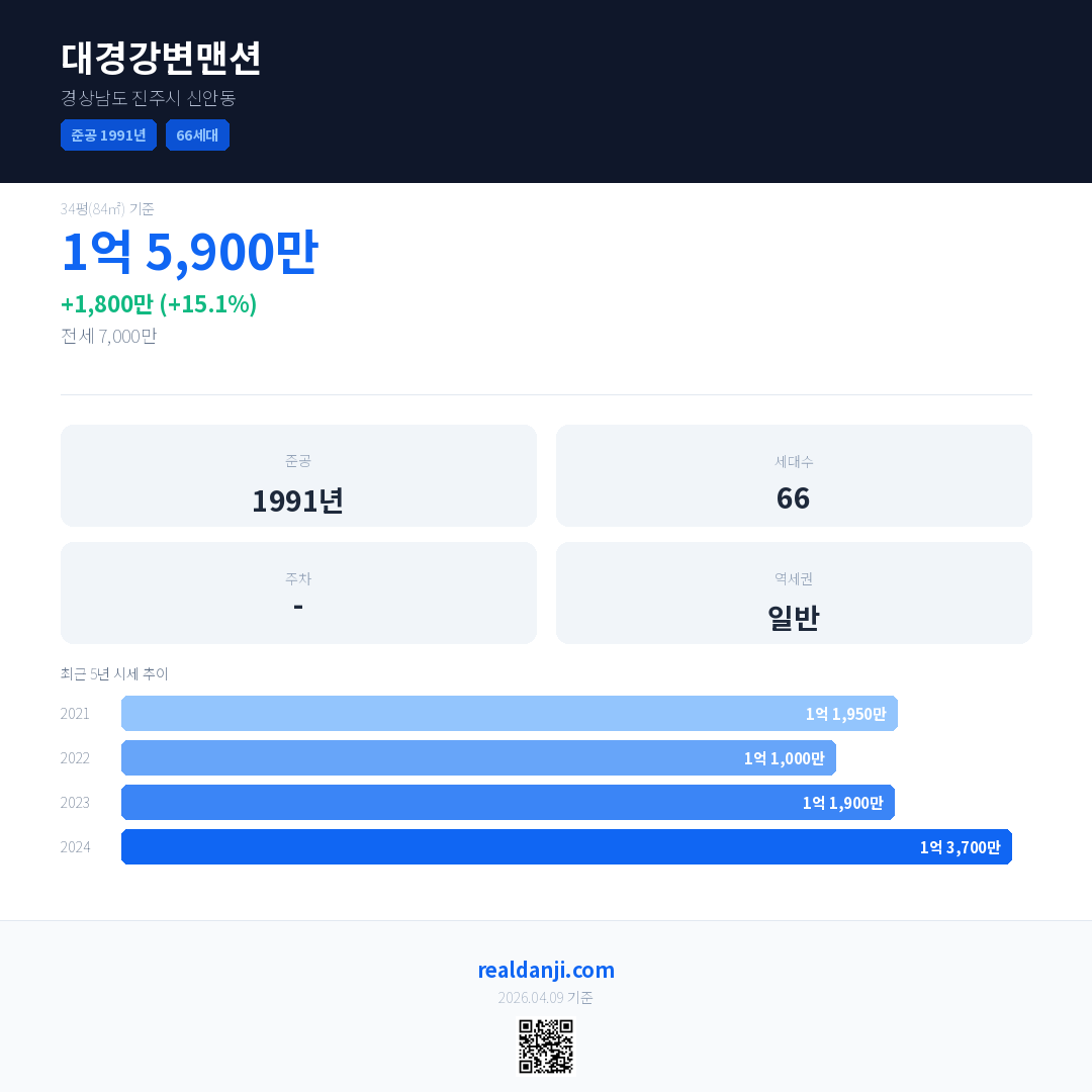 대경강변맨션 최근 거래가는 1억 5,900만입니다. (2024-11)