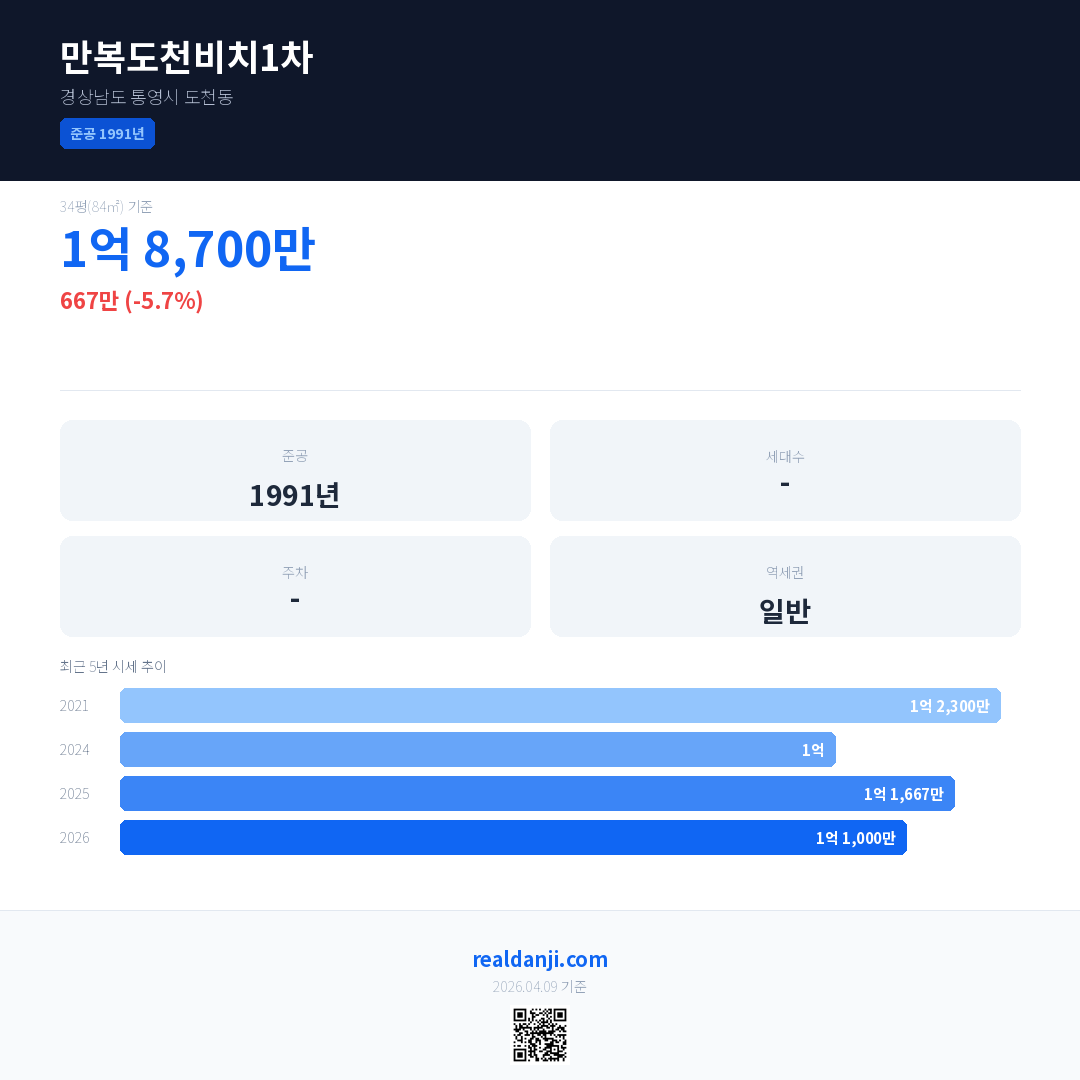 만복도천비치1차 국민평형 기준 2026년 평균 거래가는 1억 1,000만으로, 전년 대비 5.7% 하락 했습니다.