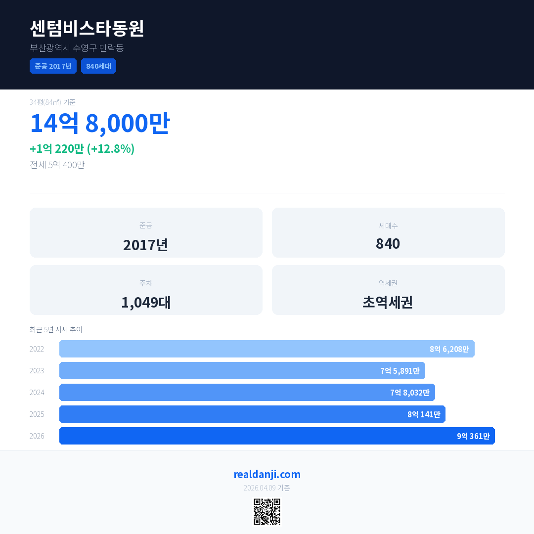 센텀비스타동원 국민평형 기준 2026년 평균 거래가는 9억 361만으로, 전년 대비 12.8% 상승 했습니다.