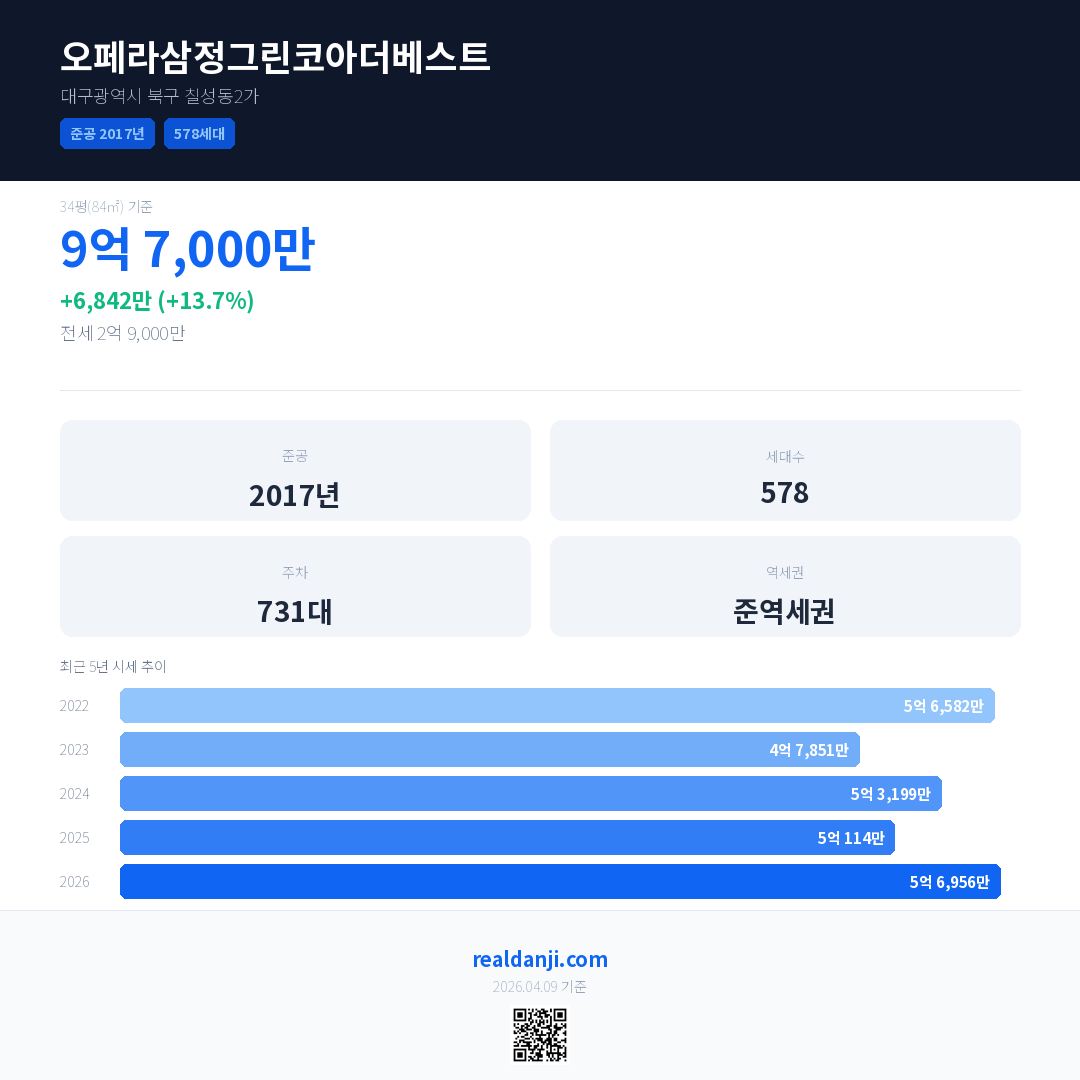 오페라삼정그린코아더베스트 국민평형 기준 2026년 평균 거래가는 5억 6,956만으로, 전년 대비 13.7% 상승 했습니다.