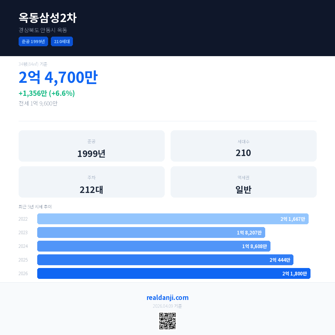 옥동삼성2차 국민평형 기준 2026년 평균 거래가는 2억 1,800만으로, 전년 대비 6.6% 상승 했습니다.