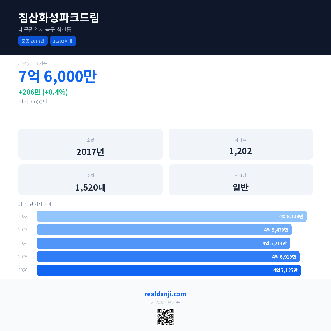 침산화성파크드림 최근 거래가는 7억 6,000만입니다. (2026-03)