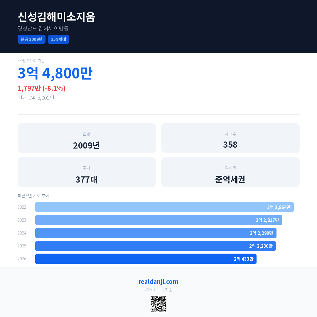 신성김해미소지움은(는) 2009년에 준공되었으며, 현재 17년차입니다. 총 358세대 규모입니다.