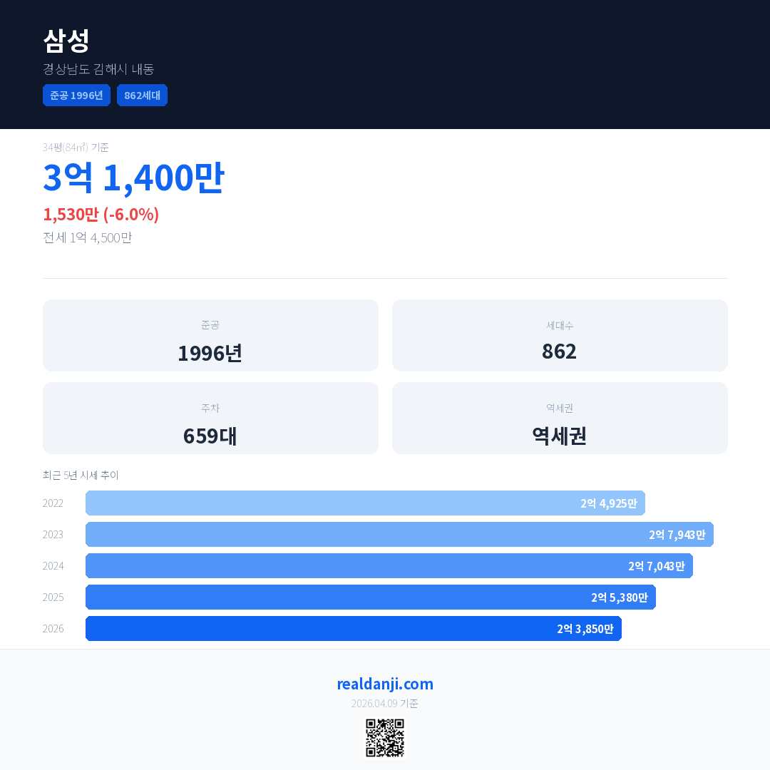 삼성 국민평형 기준 2026년 평균 거래가는 2억 3,850만으로, 전년 대비 6.0% 하락 했습니다.
