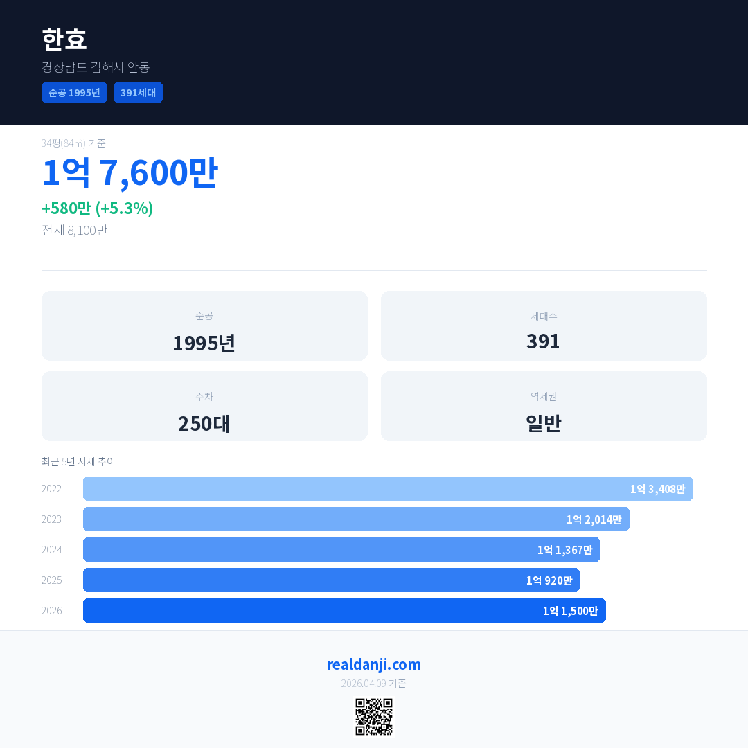 한효 국민평형 기준 2026년 평균 거래가는 1억 1,500만으로, 전년 대비 5.3% 상승 했습니다.