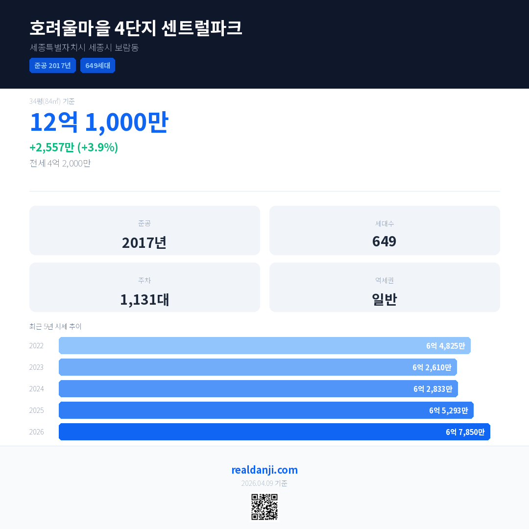 호려울마을 4단지 센트럴파크 국민평형 기준 2026년 평균 거래가는 6억 7,850만으로, 전년 대비 3.9% 상승 했습니다.