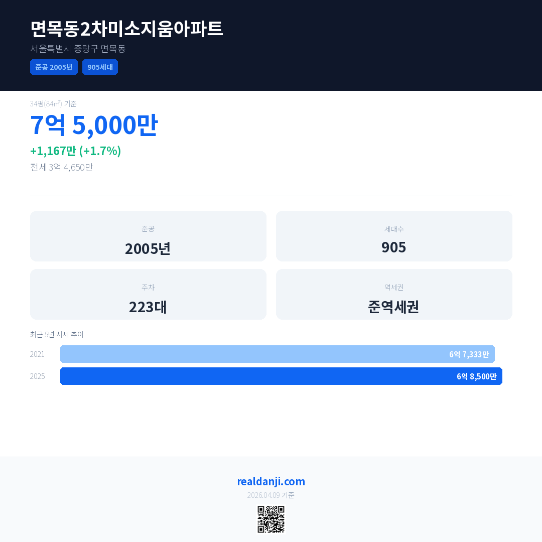 면목동2차미소지움아파트 최근 거래가는 7억 5,000만입니다. (2025-06)