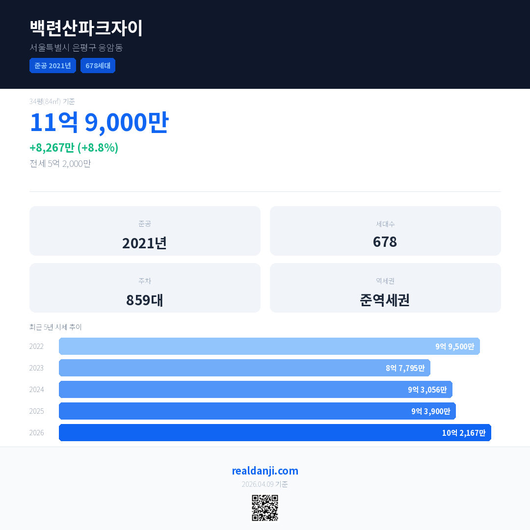 백련산파크자이 국민평형 기준 2026년 평균 거래가는 10억 2,167만으로, 전년 대비 8.8% 상승 했습니다.