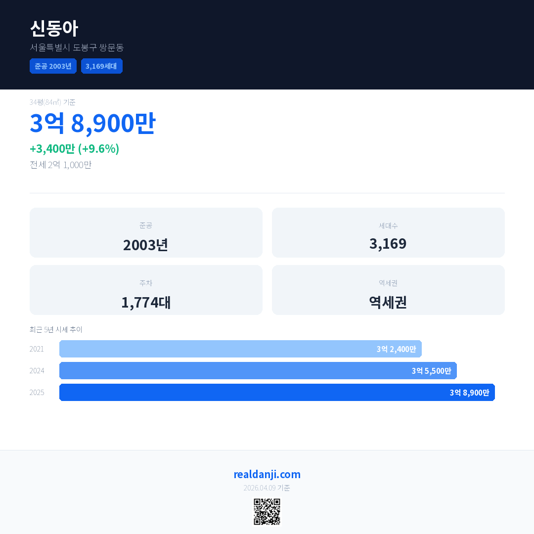 신동아 국민평형 기준 2025년 평균 거래가는 3억 8,900만으로, 전년 대비 9.6% 상승 했습니다.
