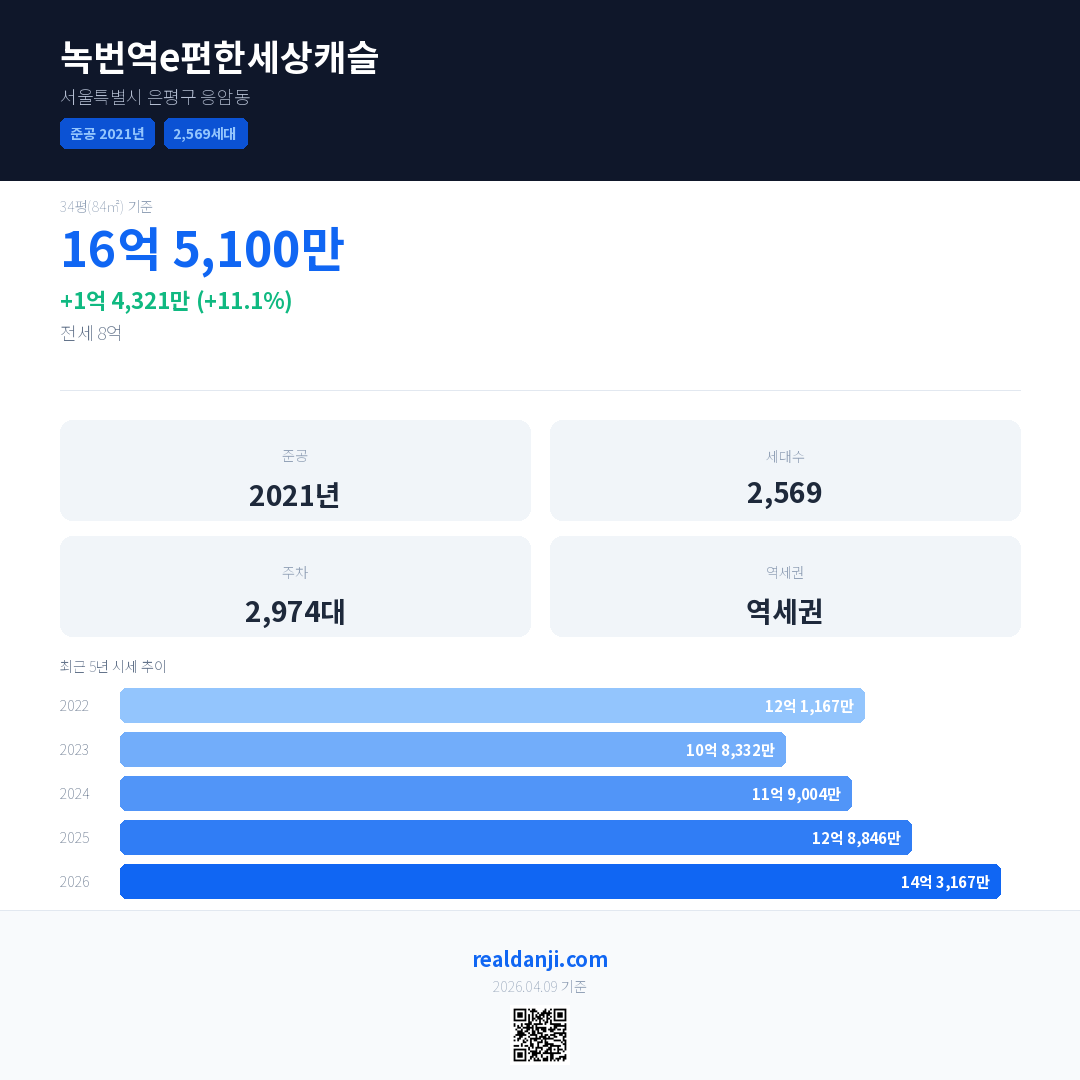 녹번역e편한세상캐슬 국민평형 기준 2026년 평균 거래가는 14억 3,167만으로, 전년 대비 11.1% 상승 했습니다.
