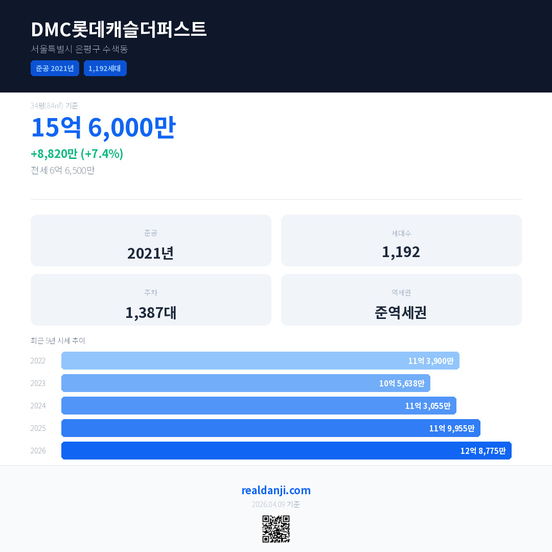 DMC롯데캐슬더퍼스트 국민평형 기준 2026년 평균 거래가는 12억 8,775만으로, 전년 대비 7.4% 상승 했습니다.