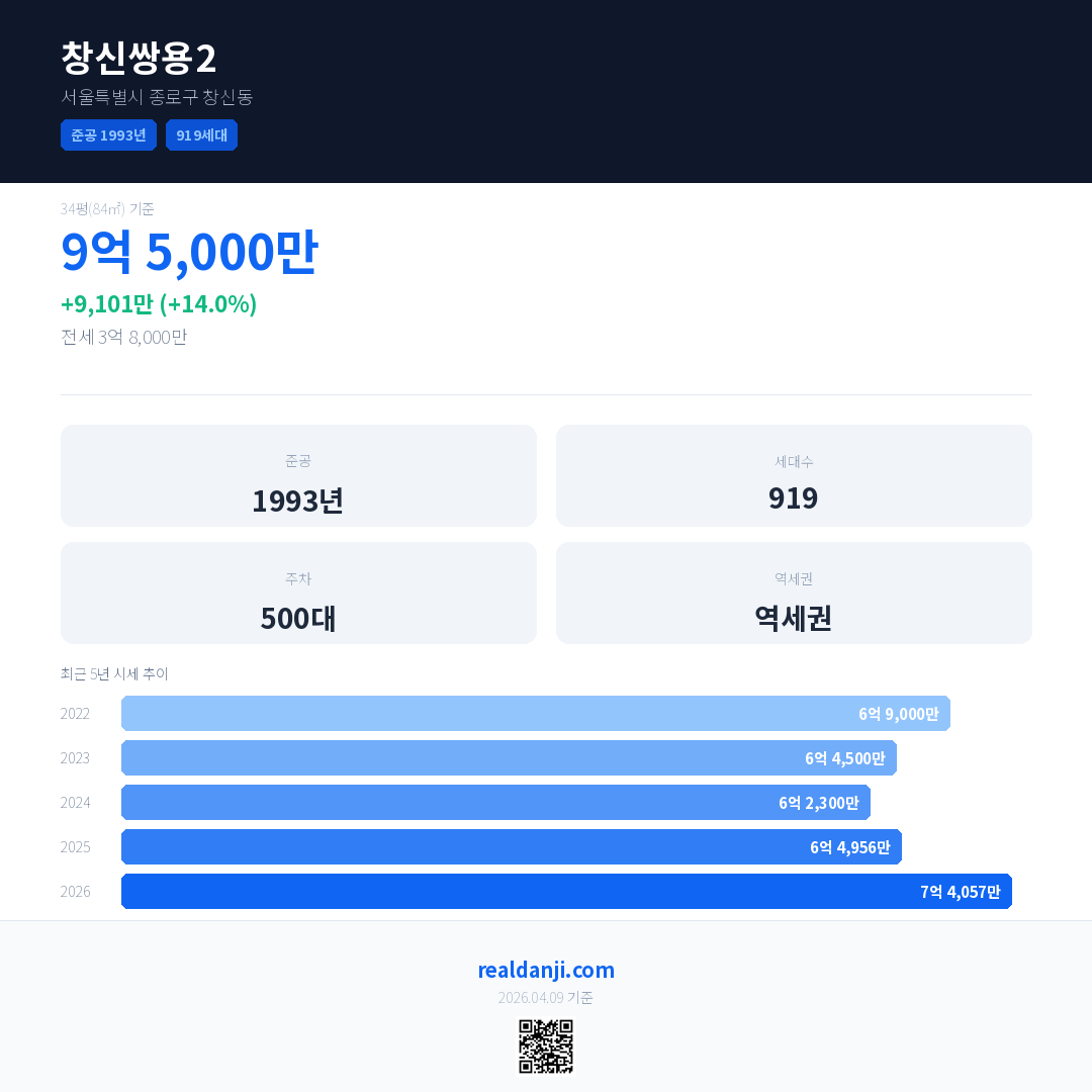 창신쌍용2 국민평형 기준 2026년 평균 거래가는 7억 4,057만으로, 전년 대비 14.0% 상승 했습니다.