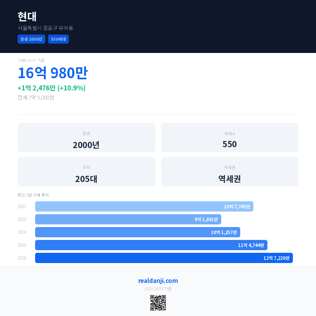 현대 국민평형 기준 2026년 평균 거래가는 12억 7,220만으로, 전년 대비 10.9% 상승 했습니다.