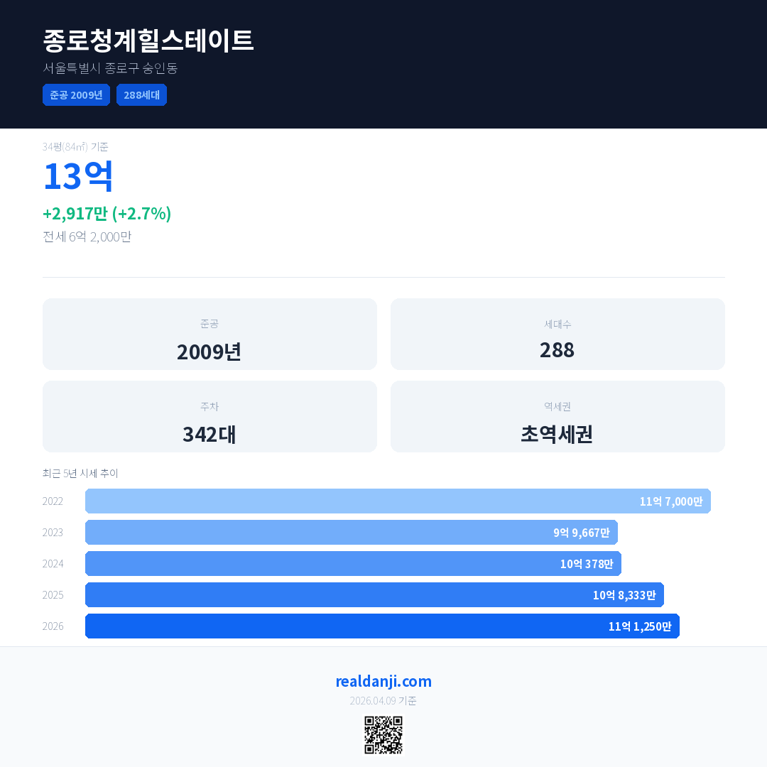 종로청계힐스테이트 국민평형 기준 2026년 평균 거래가는 11억 1,250만으로, 전년 대비 2.7% 상승 했습니다.
