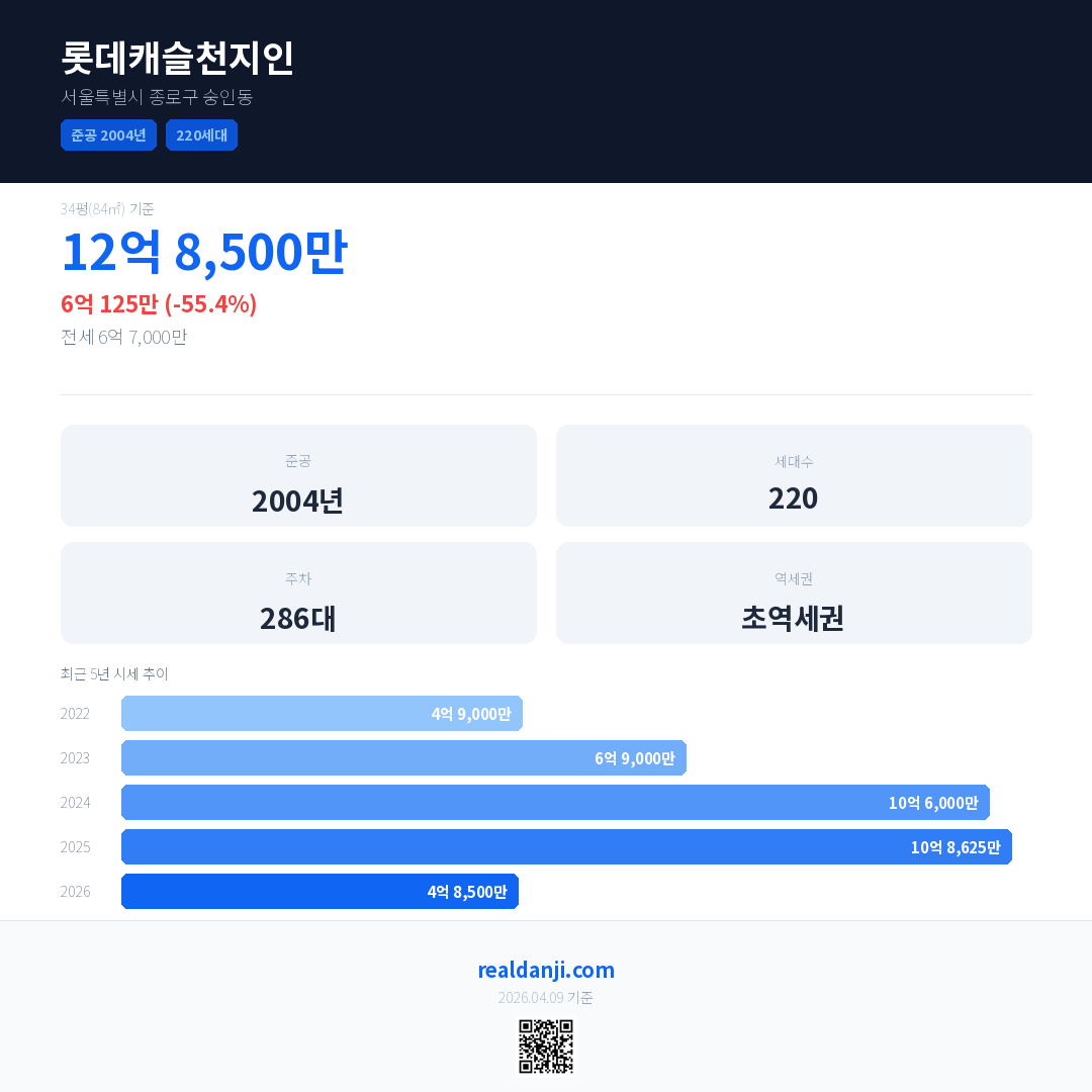 롯데캐슬천지인 국민평형 기준 2026년 평균 거래가는 4억 8,500만으로, 전년 대비 55.4% 하락 했습니다.