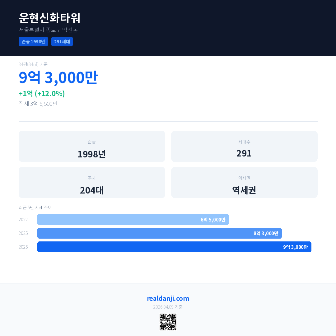 운현신화타워 최근 거래가는 9억 3,000만입니다. (2026-03)
