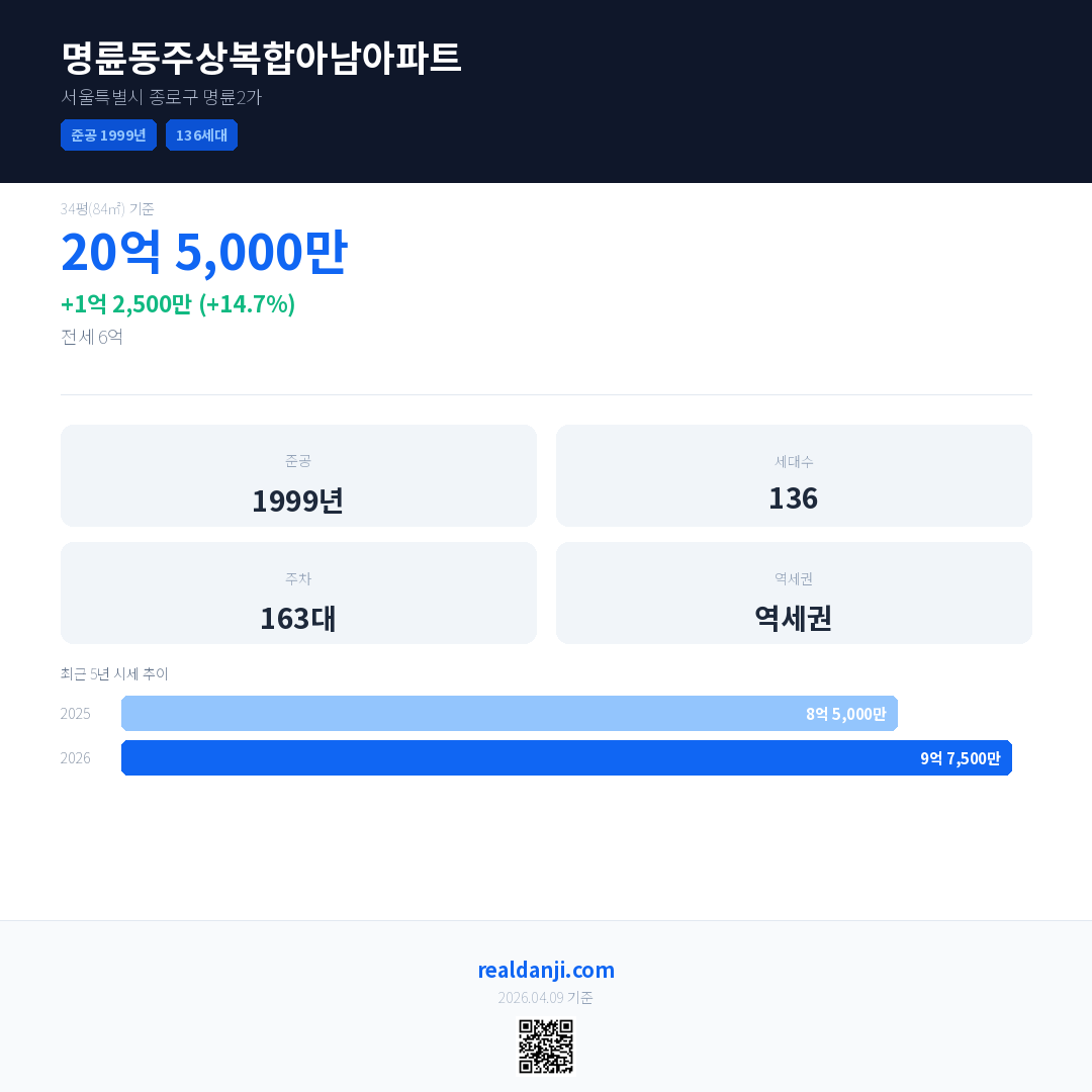 명륜동주상복합아남아파트 최근 거래가는 20억 5,000만입니다. (2026-03)