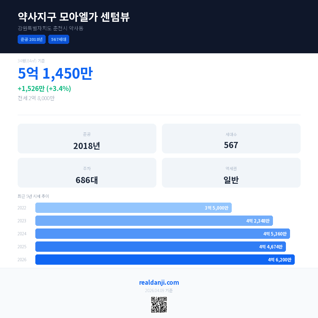 약사지구 모아엘가 센텀뷰 국민평형 기준 2026년 평균 거래가는 4억 6,200만으로, 전년 대비 3.4% 상승 했습니다.