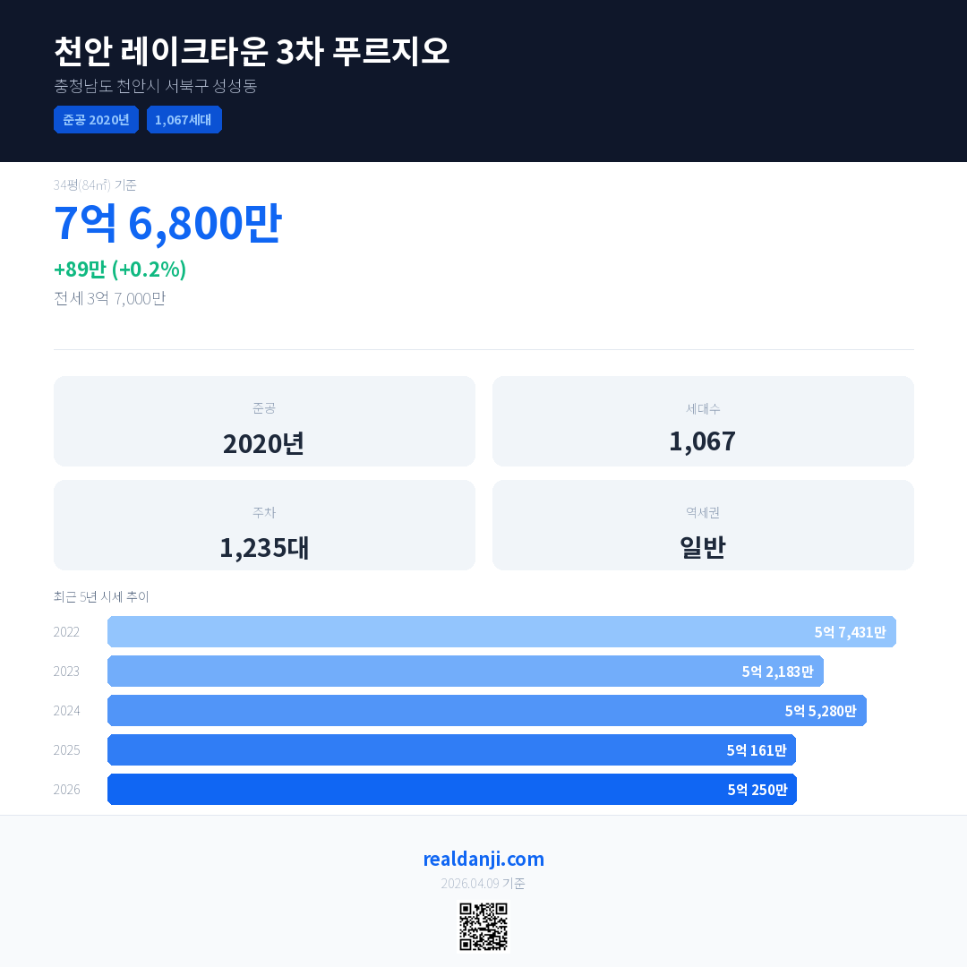 천안 레이크타운 3차 푸르지오 국민평형 기준 2026년 평균 거래가는 5억 250만으로, 전년 대비 0.2% 상승 했습니다.