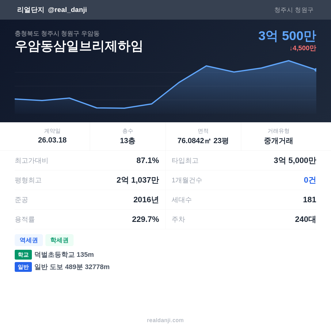 우암동삼일브리제하임 최근 거래가는 3억 5,000만입니다. (2026-03)
