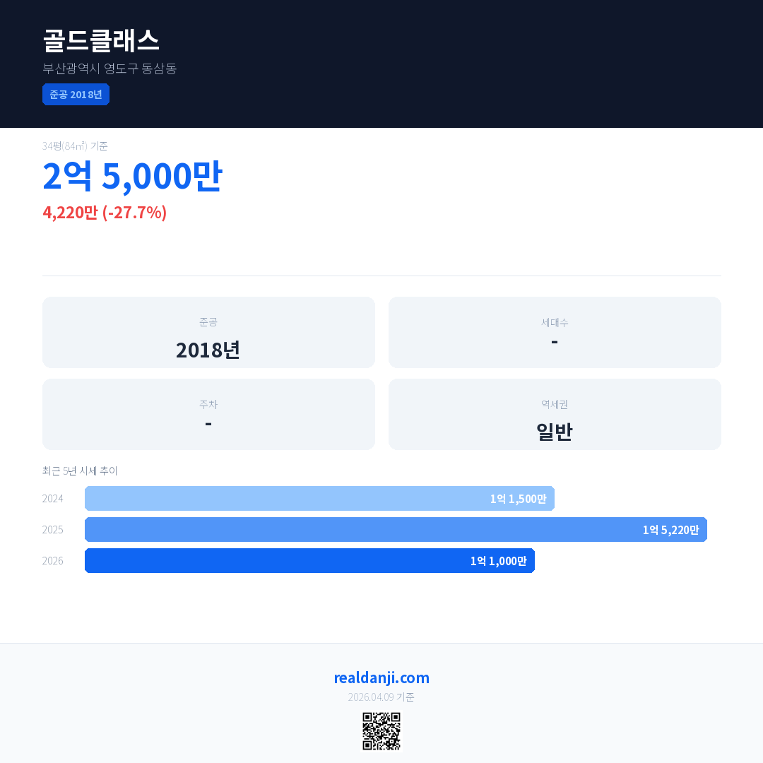 골드클래스 국민평형 기준 2026년 평균 거래가는 1억 1,000만으로, 전년 대비 27.7% 하락 했습니다.