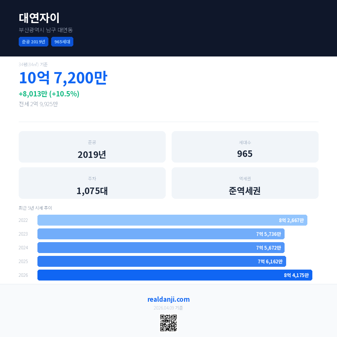 대연자이 국민평형 기준 2026년 평균 거래가는 8억 4,175만으로, 전년 대비 10.5% 상승 했습니다.
