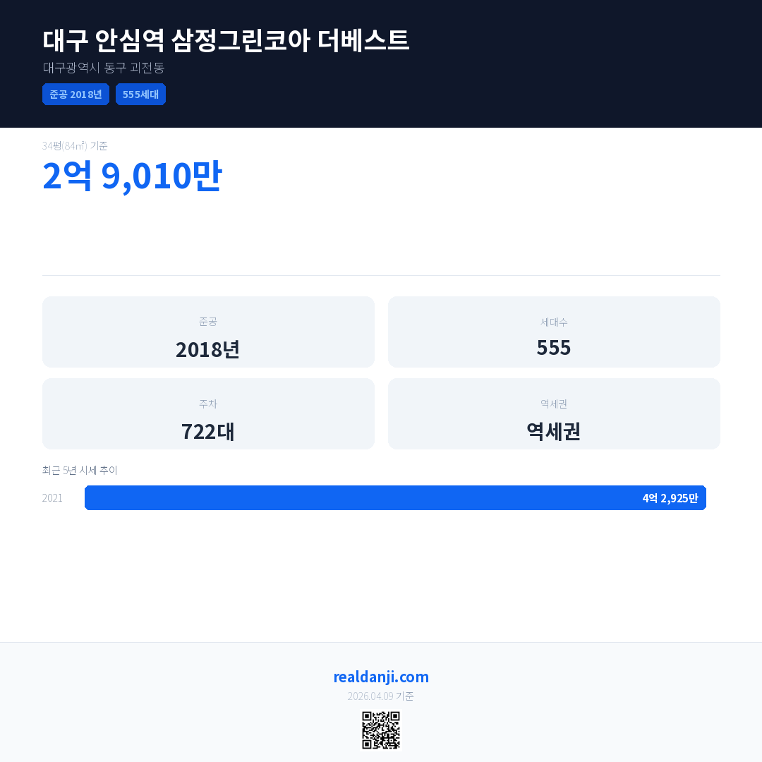 대구 안심역 삼정그린코아 더베스트은(는) 2018년에 준공되었으며, 현재 8년차입니다. 총 555세대 규모입니다.