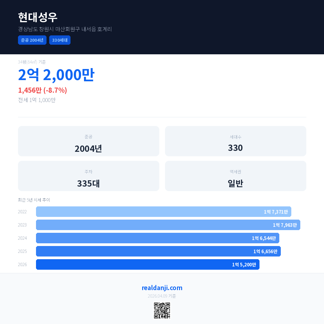 현대성우 국민평형 기준 2026년 평균 거래가는 1억 5,200만으로, 전년 대비 8.7% 하락 했습니다.