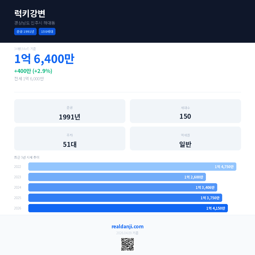 럭키강변 국민평형 기준 2026년 평균 거래가는 1억 4,150만으로, 전년 대비 2.9% 상승 했습니다.