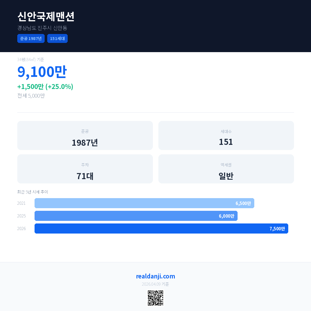 신안국제맨션 국민평형 기준 2026년 평균 거래가는 7,500만으로, 전년 대비 25.0% 상승 했습니다.