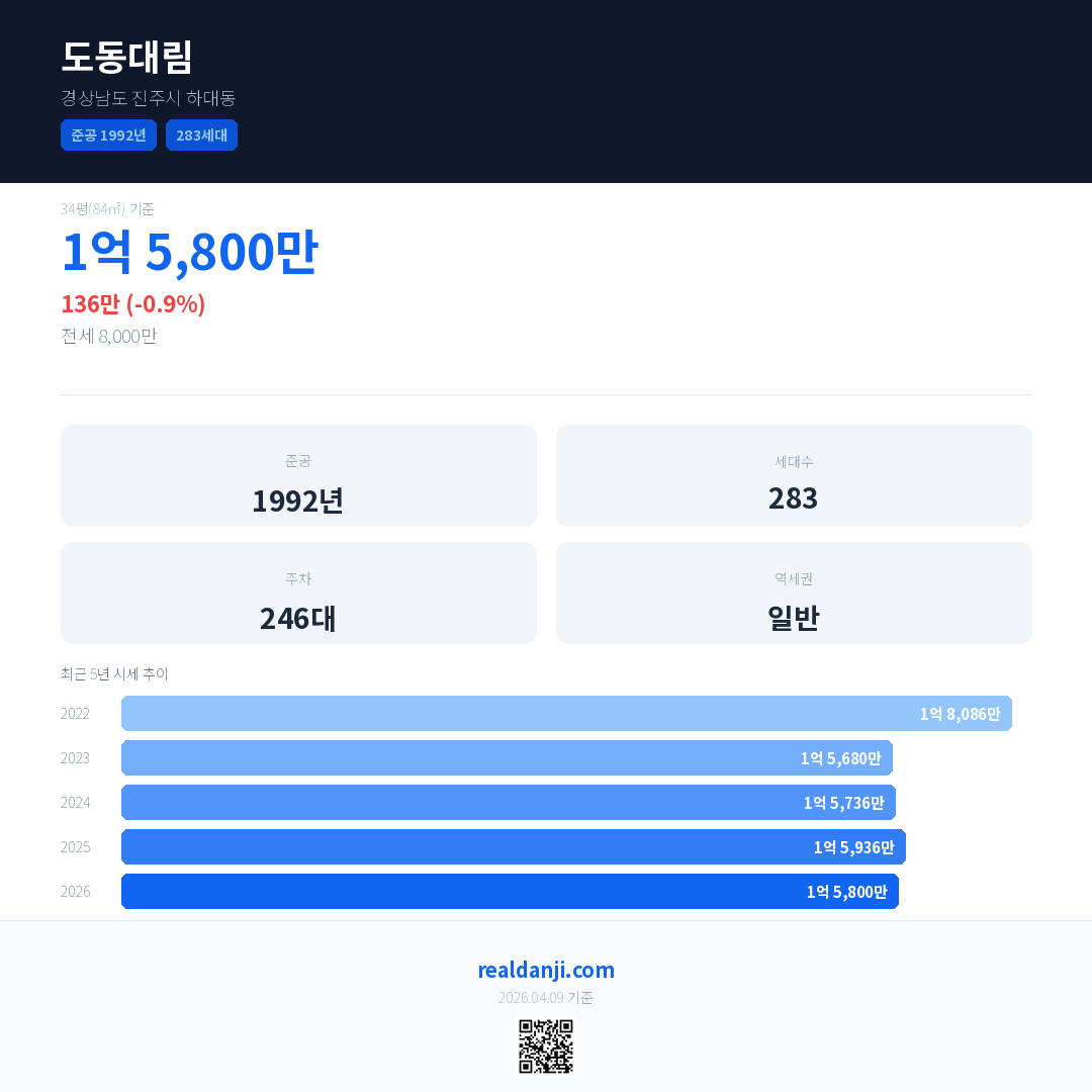도동대림 국민평형 기준 2026년 평균 거래가는 1억 5,800만으로, 전년 대비 0.9% 하락 했습니다.