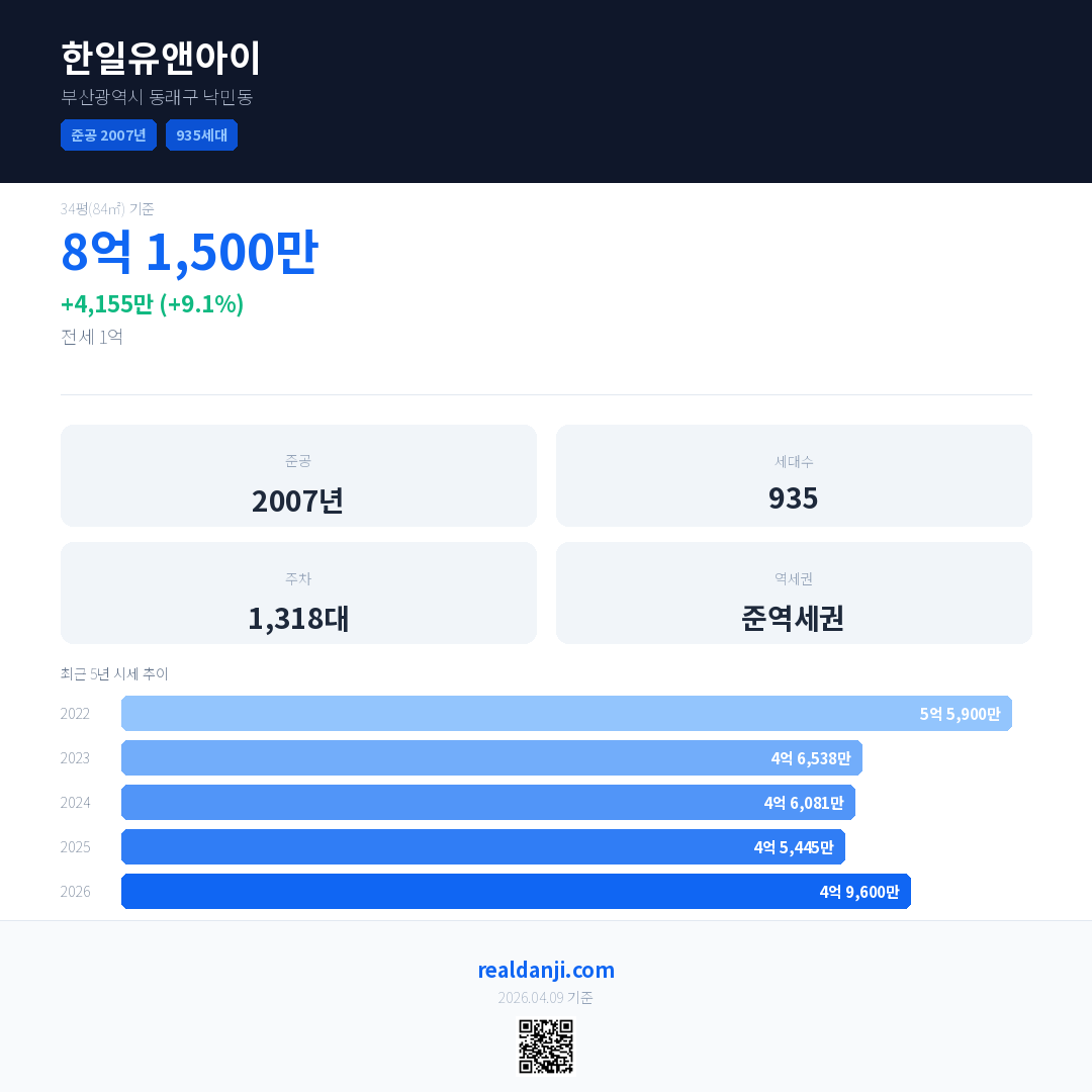 한일유앤아이 국민평형 기준 2026년 평균 거래가는 4억 9,600만으로, 전년 대비 9.1% 상승 했습니다.