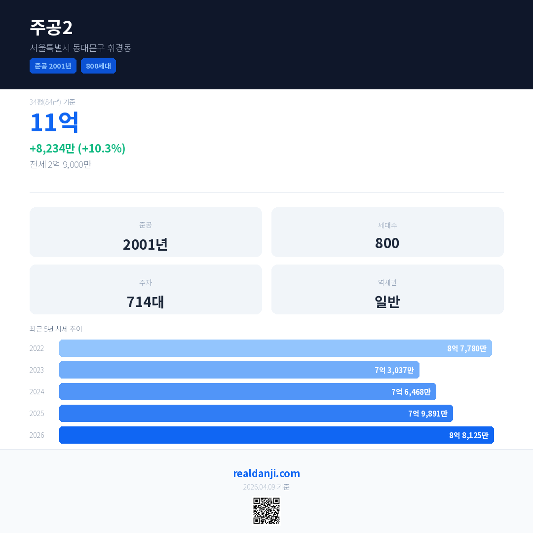 주공2은(는) 2001년에 준공되었으며, 현재 25년차입니다. 총 800세대 규모입니다.