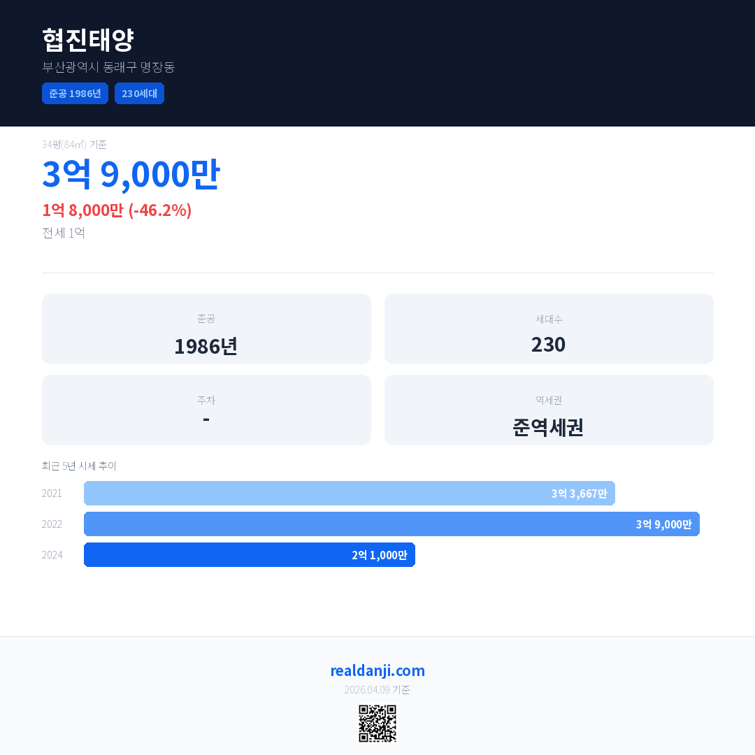 협진태양 국민평형 기준 2024년 평균 거래가는 2억 1,000만으로, 전년 대비 46.2% 하락 했습니다.