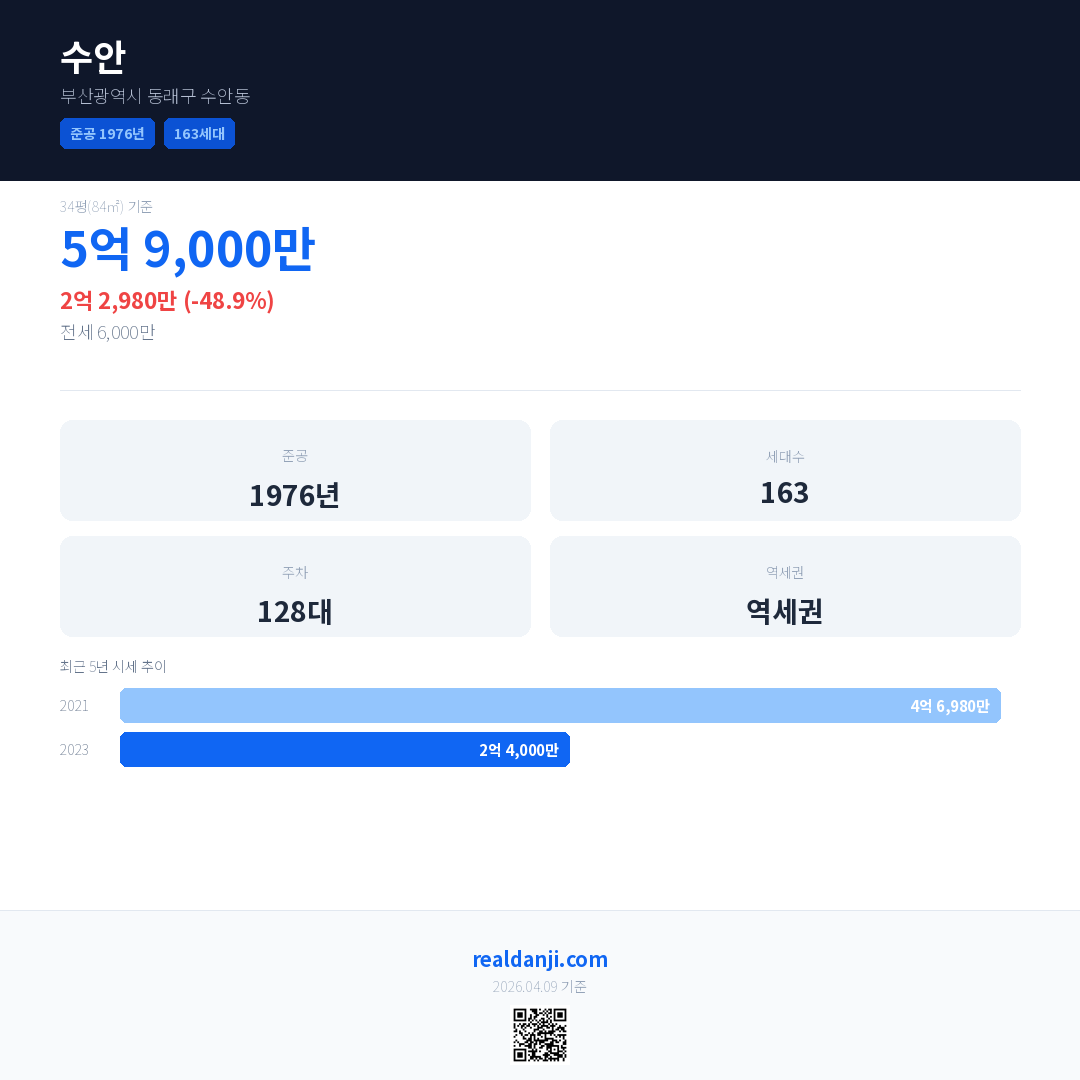 수안은(는) 1976년에 준공되었으며, 현재 50년차입니다. 총 163세대 규모입니다.
