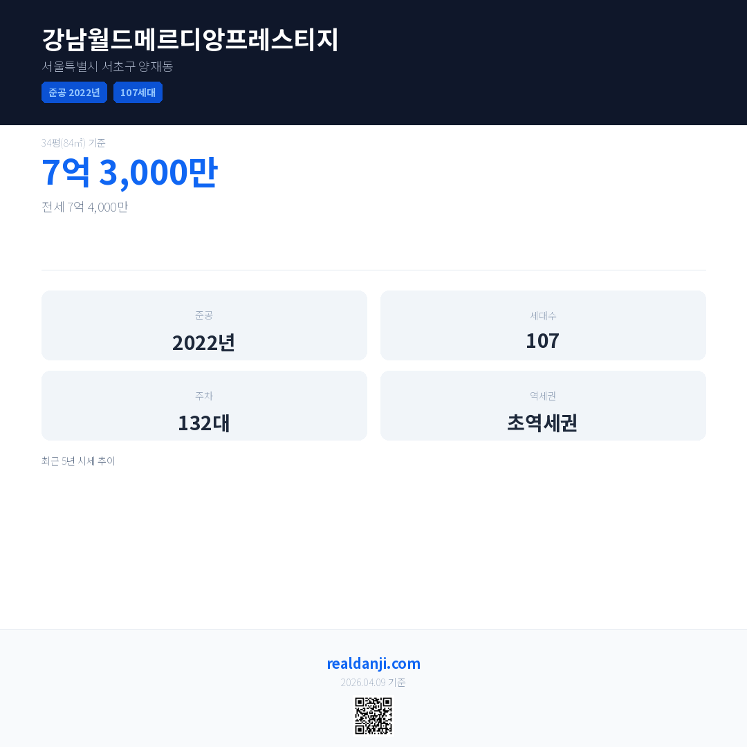 강남월드메르디앙프레스티지은(는) 2022년에 준공되었으며, 현재 4년차입니다. 총 107세대 규모입니다.