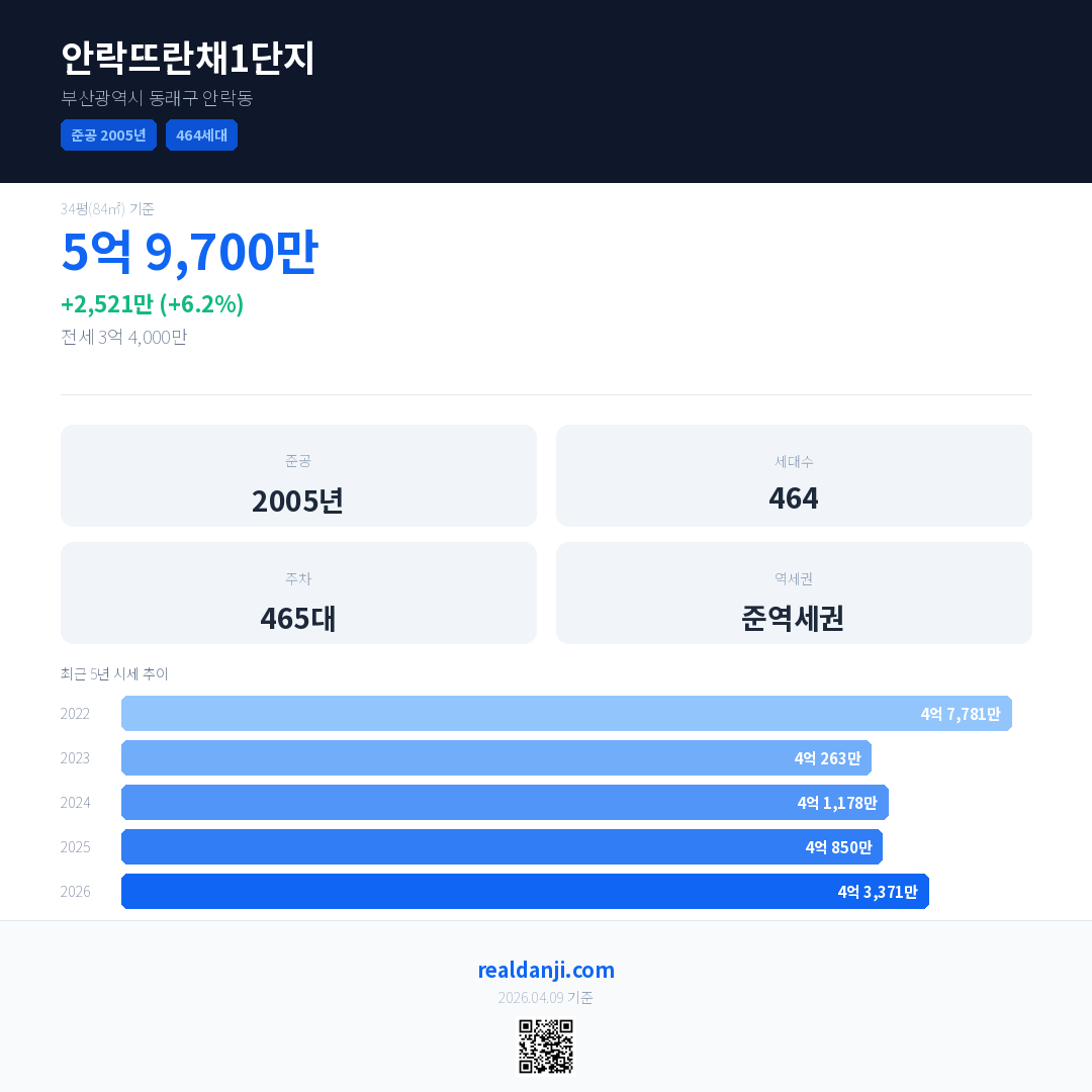 안락뜨란채1단지 국민평형 기준 2026년 평균 거래가는 4억 3,371만으로, 전년 대비 6.2% 상승 했습니다.