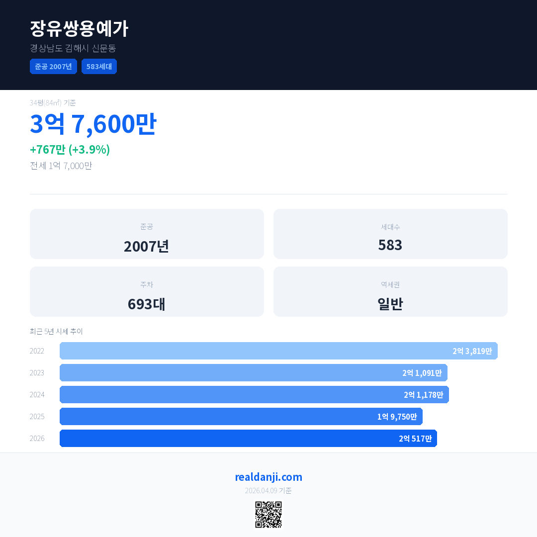장유쌍용예가 최근 거래가는 3억 7,600만입니다. (2026-03)