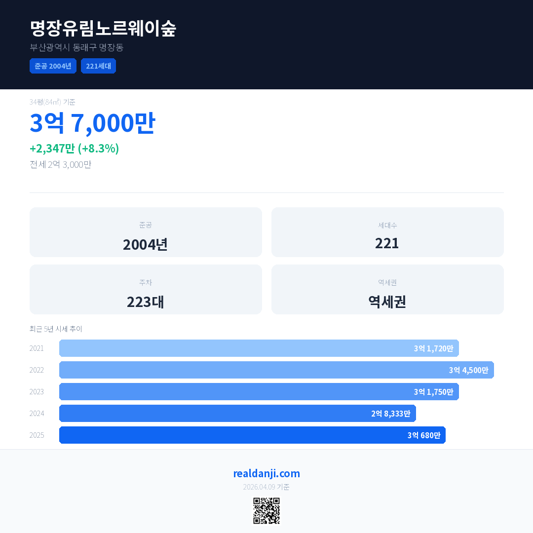 명장유림노르웨이숲 국민평형 기준 2025년 평균 거래가는 3억 680만으로, 전년 대비 8.3% 상승 했습니다.