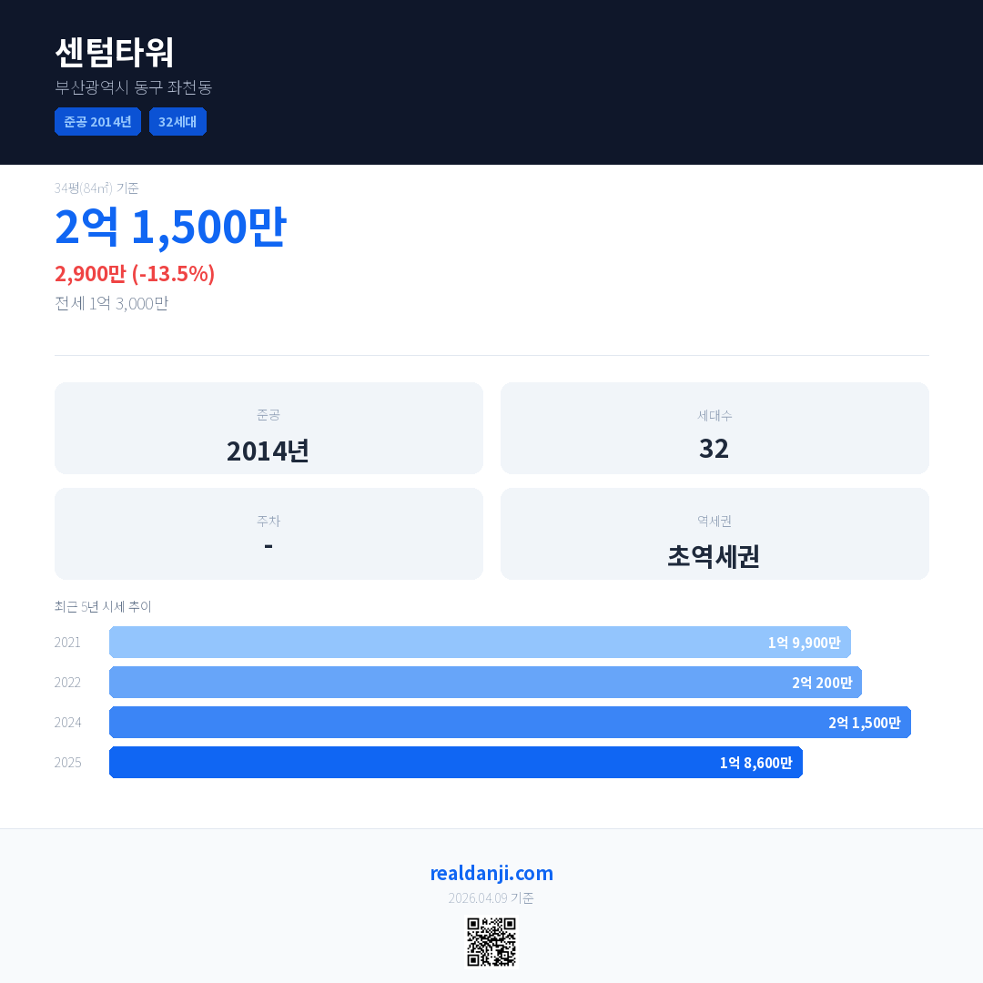 센텀타워 최근 거래가는 2억 1,500만입니다. (2025-08)